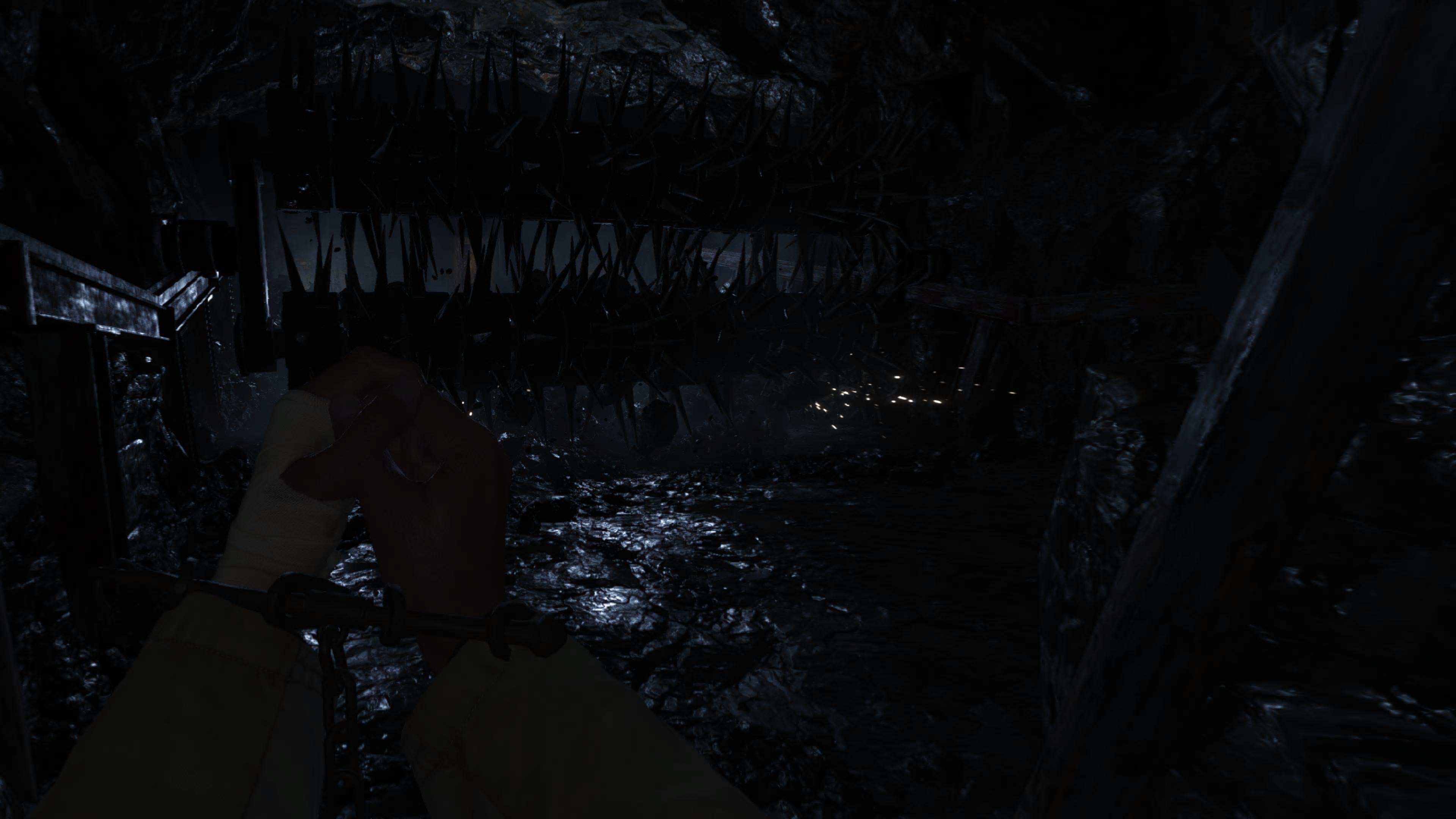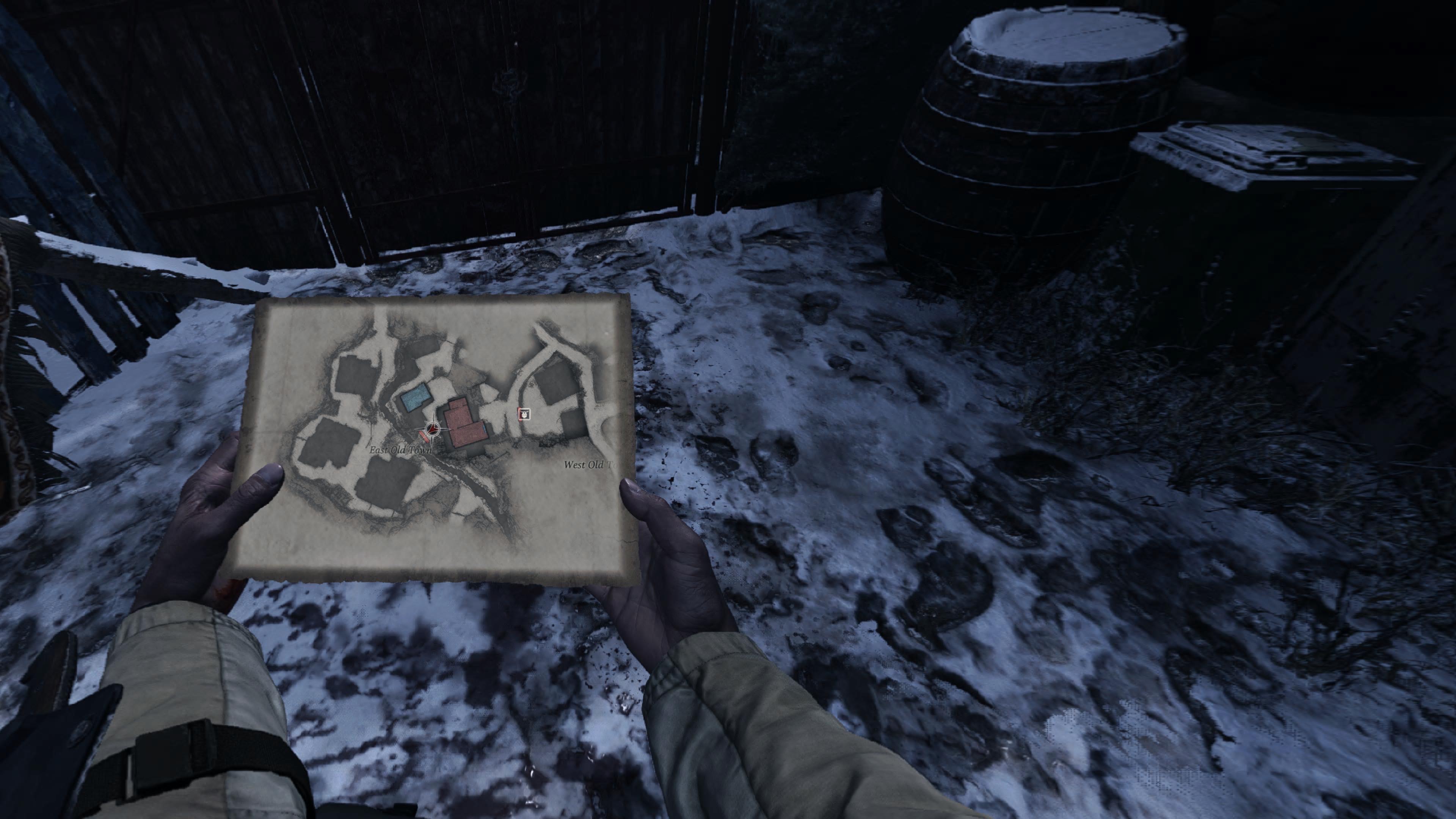 There’s shoulder grabbing for bigger weapons like shotguns, your pistol is on your hip, the knife is on a strap on your wrist: but Village takes things one step further by cramming stuff into your jacket (you need to grab and open either side for specific items). Basically everything is mapped to some some of control option on Ethan’s person, including an in-game item map (instead of a menu) that defaults to your back left pocket. First aid is administered by grabbing a bottle from behind your left shoulder, popping the cap off with a button press, then pouring it over your body. Dual-wielding is possible, and double pistols is especially viable. Using the knife and putting your hands up to block (and holding the triggers and swinging forward to punch) is similarly responsive and easy to learn. Big bonus points to the development team for allowing you to break glass with your fists instead of pulling out the knife each time!