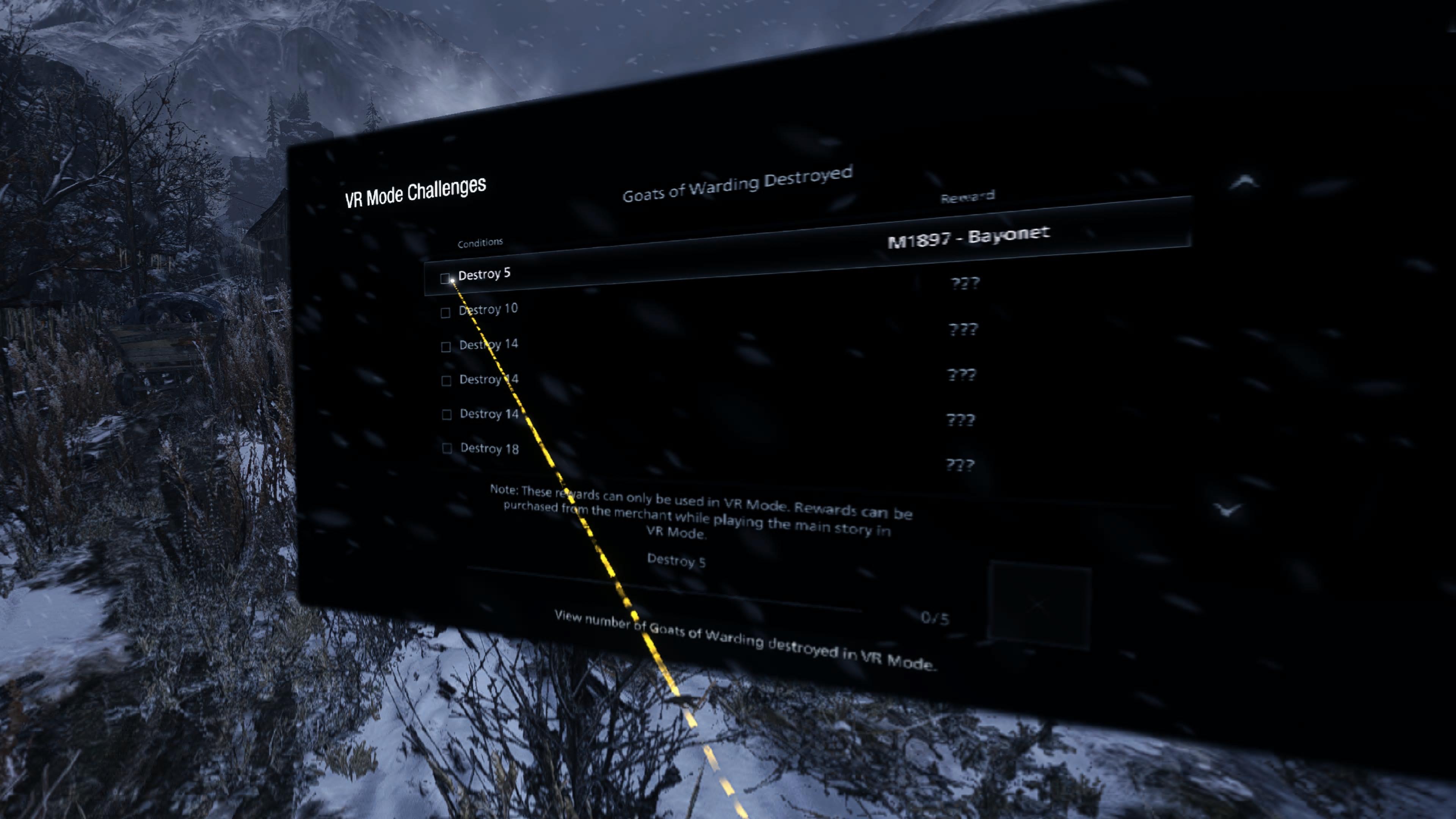 As we mentioned above, RE Village VR is a completely separate mode. You’ll need to start over from the beginning (works for me!) and you can thankfully skip cutscenes if you’ve seen them already (which are viewable in VR format, or the traditional “movie theater screen” presentation via a pause menu toggle). It also has its own set of “VR Mode Challenges,” like finding and shooting the main Goats of Warding collectibles for merchant rewards: plus, you can swap back to the original mode from the main menu if you’re getting freaked out. And you’ll likely get freaked out at least once!