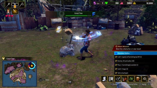 That said, it’s not all roses on Dondoko Island. The action combat doesn’t feel particularly great, and there’s a lot of it. And really, it’s a mode that feels like it’ll be best to revisit throughout the journey, rather than breeze through in one go. Eventually, visitors can start going to the island, and you’ll need to manage their wants and needs in an almost tycoon-style fashion. Getting some of the better, and more fun, visitors means finding them back in the open world of the main game, and progressing both the main story and various substories.
