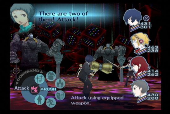 The thing that’s most striking about the game is the contrast — there’s a dark side and a light side going on at once. Just like half the game is Dark Hour dungeon crawling and the other half is sunny school days, there are surface issues and unseen innuendos. The word Persona means “the mask or façade presented to satisfy the demands of the situation or the environment,” and that’s what they are — you summon different persona based on how their skills correspond to the enemies, and you tell the people in your life exactly what they want to hear in order to earn their trust. You’re not the only one doing this, either — there are some intriguing sub-plots among the main characters that suggest that maybe the friends you’re familiar with are just putting their best face forward, too.