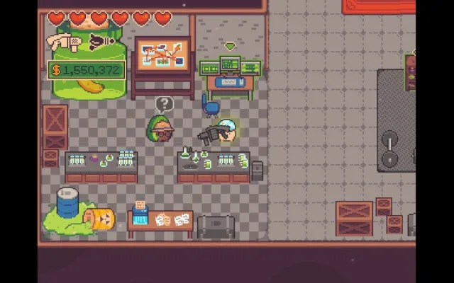 Turnip Boy Robs a Bank puts the lite in roguelite with some very surface level, but still effective, genre trappings. Most weapons are found in the wild, and you can spend some cash to up the odds of finding the good stuff. It’s all random, so some bank runs will yield more effective results than others. Taking new discoveries back to the hideout will give you a chance to offer them to one of the Twins for weapon research. The more you raise your research level, the more weapons you’ll find permanently added to your loadout options.