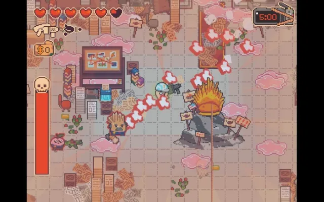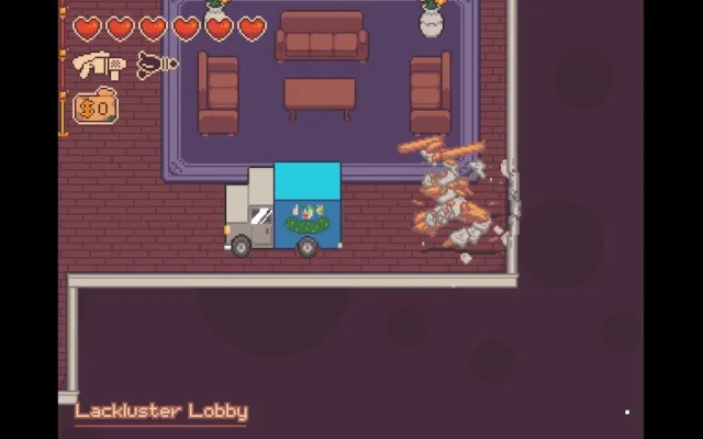 After linking up with the Pickled Gang, Turnip Boy quickly starts the loop of crashing their van into the bank, snatching as much primo loot as possible, and escaping before the timer runs out and the peach fuzz drops in full force. Prepare to get very familiar with this place, because outside of the single-room hideout it’s the only location in the game.