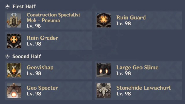 The first half features either bosses or waves of one to two enemies, encouraging teams that focus on single-target damage. Avoid Physical teams if you’re not confident that you can overcome the Ruin enemies’ Physical RES. You should also avoid Hydro DPS units since the Hydro Tulpa is immune to Hydro damage. Otherwise, there’s a lot of flexibility for you to play whomever you like!